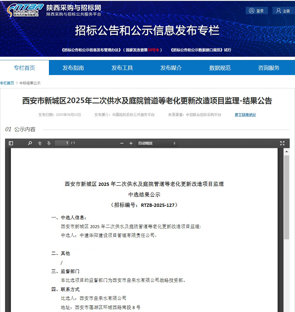 中建華陽公司中標(biāo)西安市新城區(qū)2025年二次供水及庭院管道等老化更新改造項(xiàng)目監(jiān)理